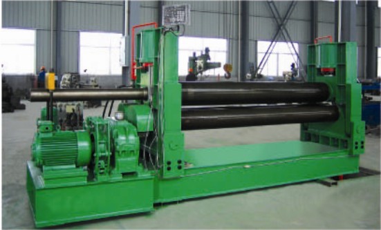 本機結(jié)構(gòu)型式對三輥對稱式,上輥在兩下輥中央對稱位置作垂直升降運動,通過液壓缸內(nèi)的液壓油作用于活塞而獲得,為液壓傳動;兩下輥作旋轉(zhuǎn)運動,通過減速機的輸出齒輪與下錕齒嚙合,為卷制板材提供扭矩.